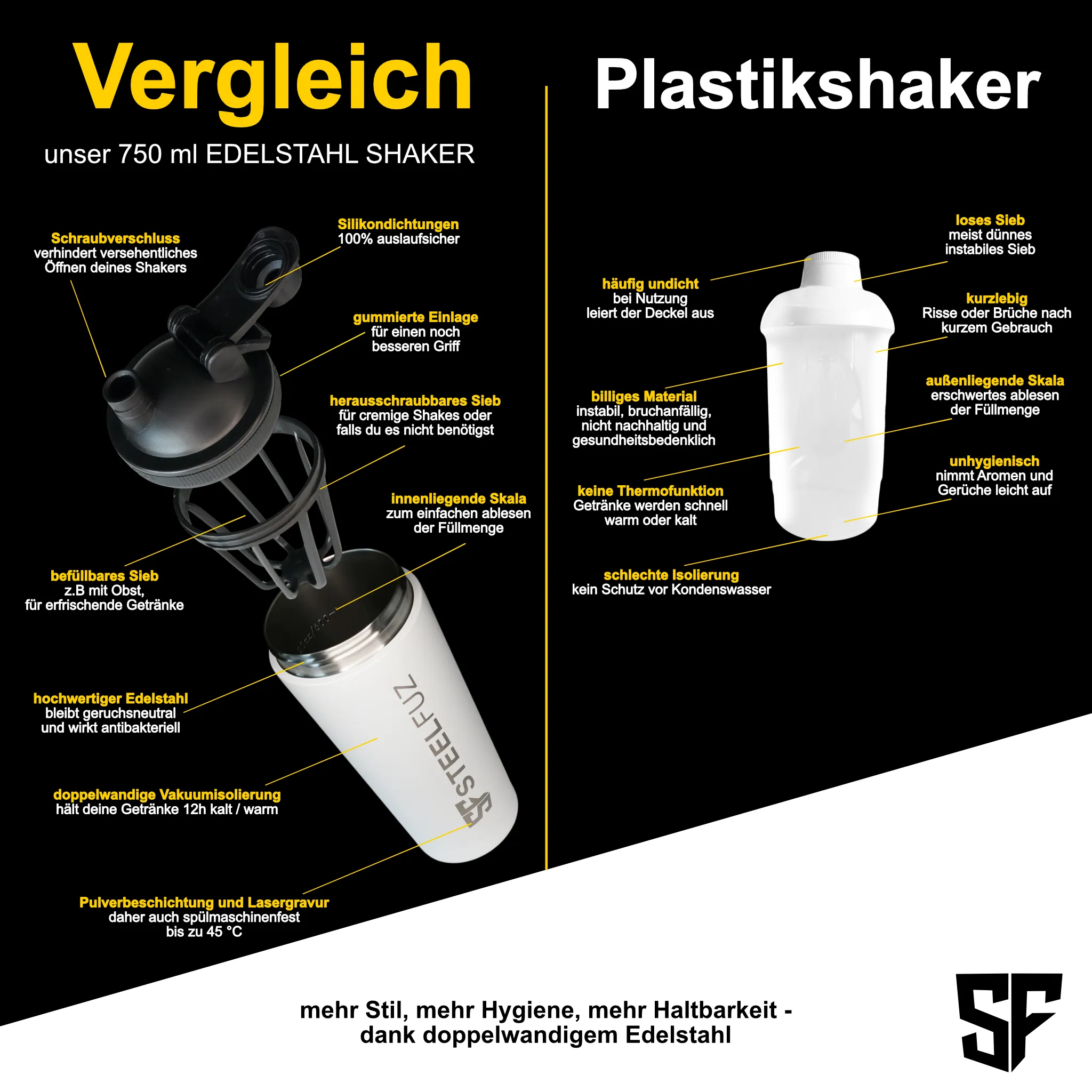 Schwarzer SteelFuz Edelstahlshaker - 750 ml Proteinshaker für Fitness